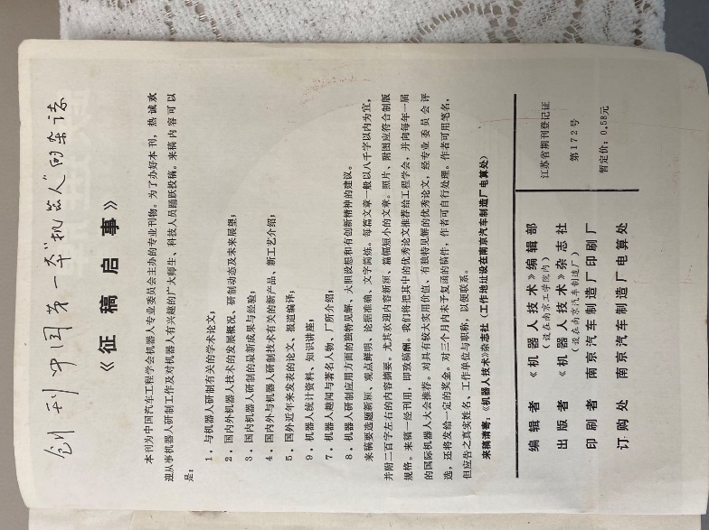 1985年:中国第一本机器人期刊《机器人技术》由南京工学院的编辑部出版,严学高教授任主编,于1987年与沈阳自动化研究所的《国外自动化》杂志合并,更名为《机器人》,成为我国最具代表性的报道机器人学及相关领域具有创新性、高水平、有重要意义的学术进展及研究成果的期刊。