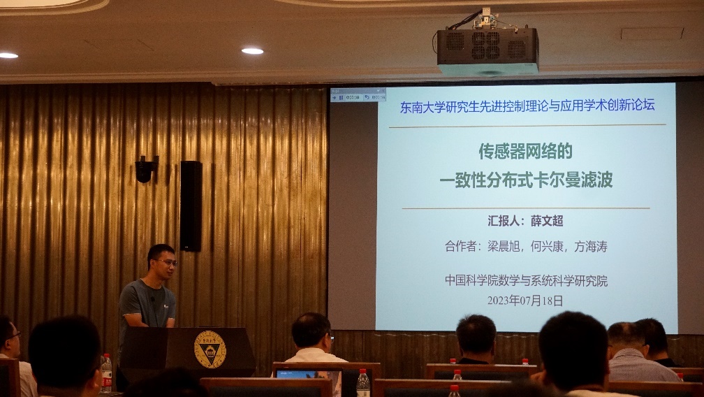 中国科学院数学与系统科学研究院薛文超副研究员作了论坛的第六场报告,题为“传感器网络的一致性分布式卡尔曼滤波”。报告针对几类基于传感器网络的系统状态估计问题,介绍了基于一致性卡尔曼滤波的分布式估计算法,并给出了算法的稳定性、一致性等分析结果。