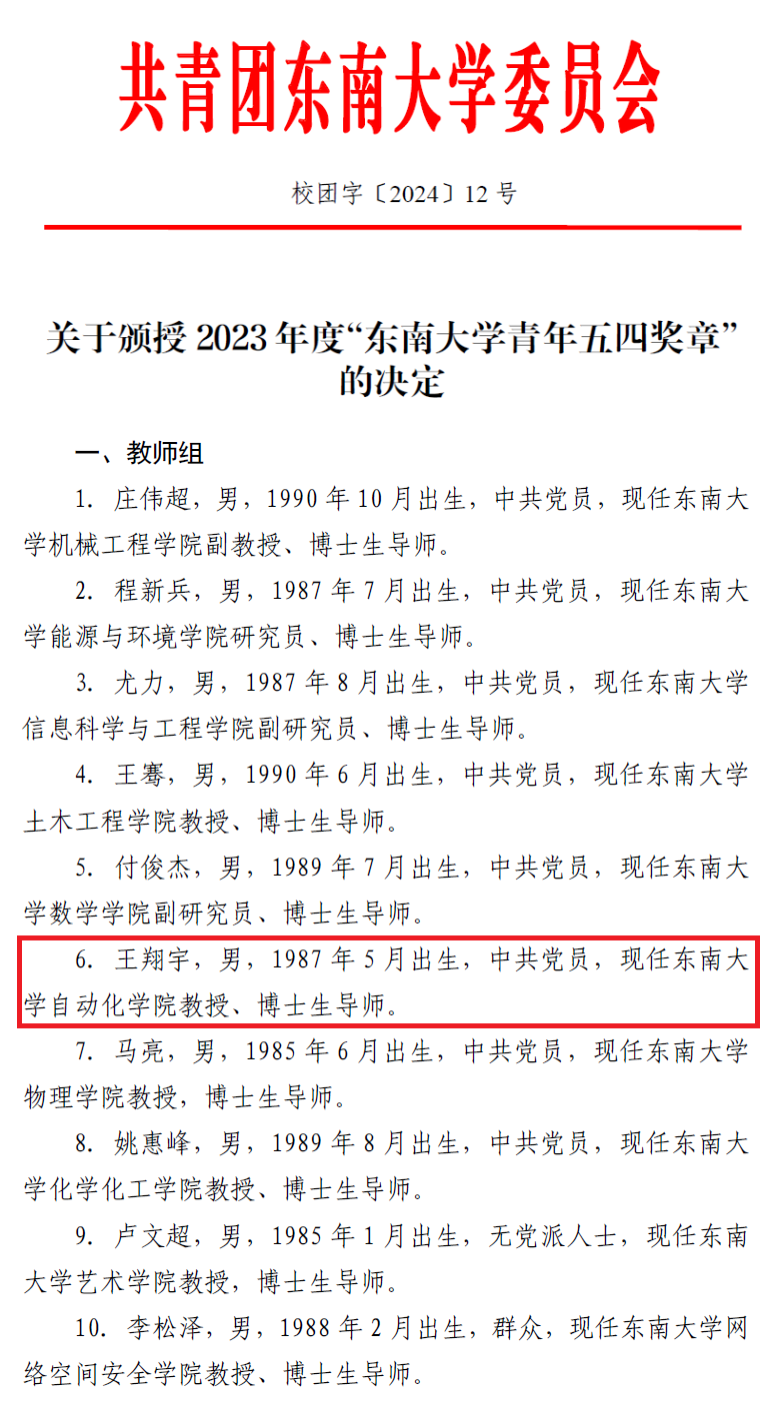 “动画疯 青年五四奖章”是共青团动画疯 委员会授予东大青年的最高荣誉,旨在树立政治进步、品德高尚、贡献突出的优秀青年典型,反映东大青年的精神品格和价值追求。我院王翔宇教授荣获2023年度“动画疯 青年五四奖章”。