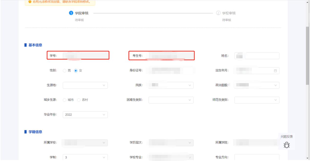 4、学号、考生号、姓名、学院、学历、手机号码、专业方向为学生无法修改项,若有无法修改的部分需要单独修改,请汇总填写附件3(前四列均需填写)后将表格发给年级辅导员。