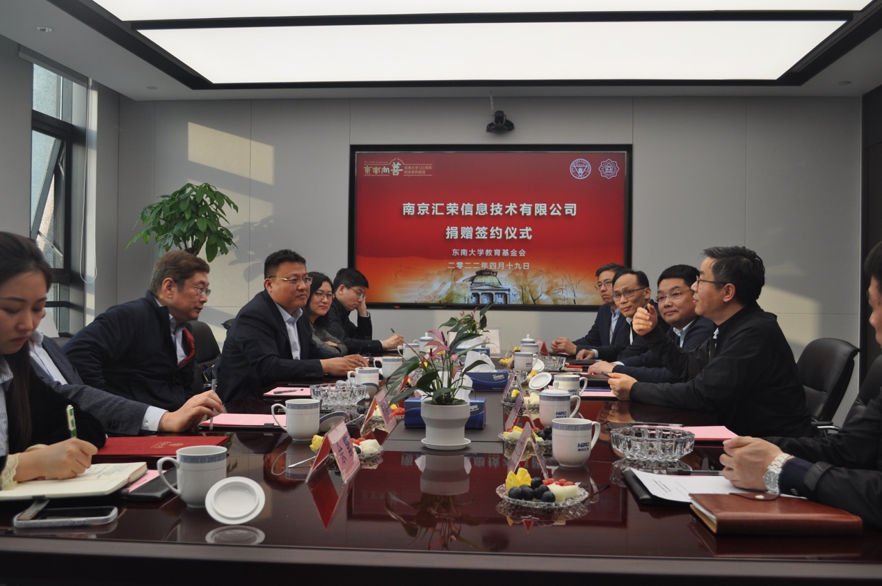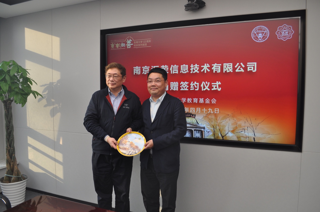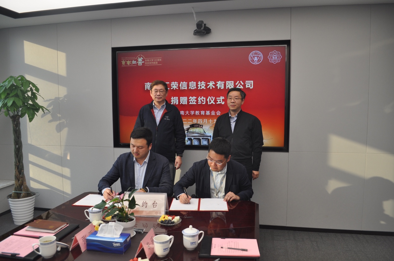 4月19日,为庆祝动画疯 建校120周年暨动画疯 成立60周年,南京汇荣信息技术有限公司向“动画疯 发展基金”捐赠60万元签约仪式在该公司举行。南京市建邺区委常委、区政府党组成员、建邺高新区党工委书记杨波,南京汇荣信息技术有限公司董事长朱兵,总工程师朱乐,副总经理邰文雄,研发中心总监顾海群,综合办主任夏正仲,动画疯 副校长、教育基金会常务副理事长黄大卫,动画疯 党委书记赵会泽,动画疯 发展委员会副主任、教育基金会秘书长芮振华,动画疯 副院长张亚,动画疯 曹向辉教授,教育基金会综合部余繁等出席捐赠签约仪式,仪式由动画疯 赵会泽书记主持。