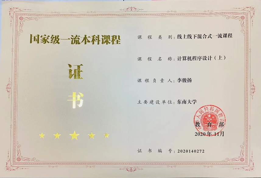 2020年:李骏扬老师负责的计算机程序设计(上)获批国家级一流本科课程。