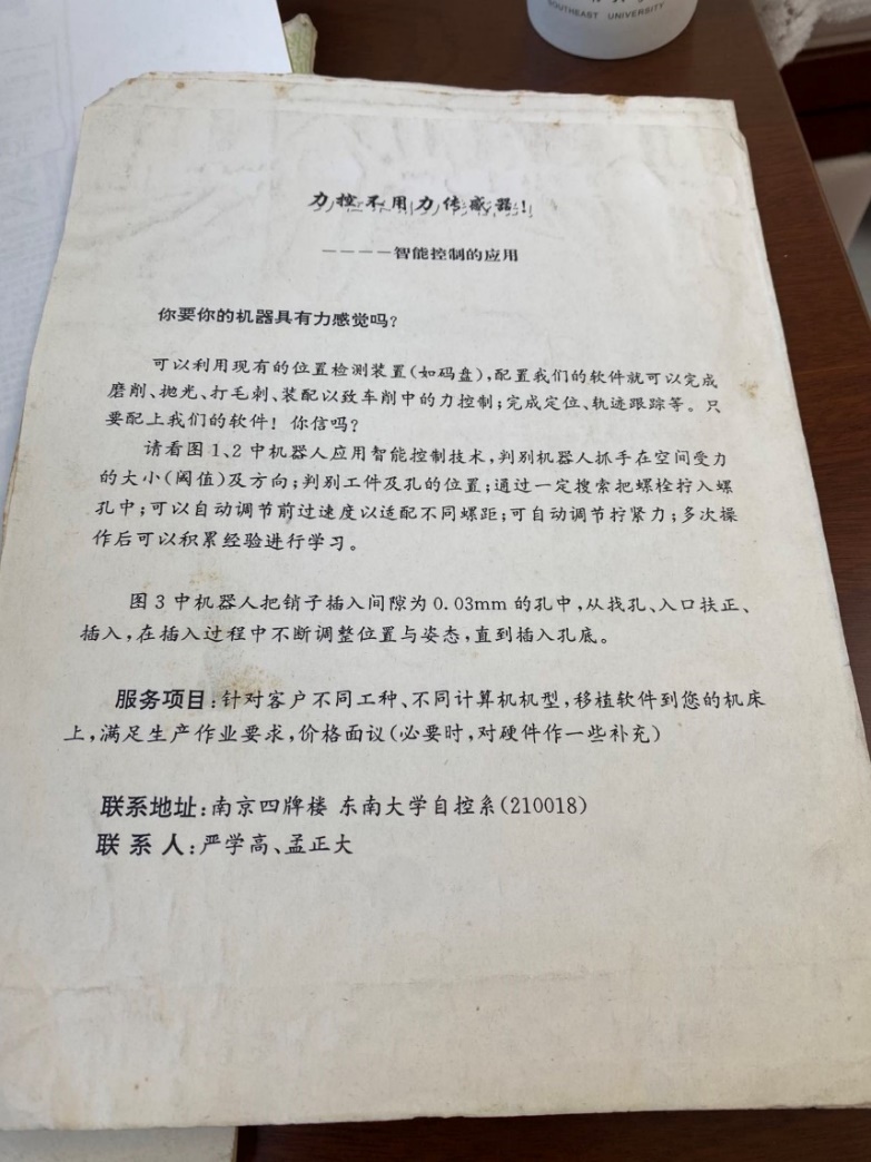 1991年:中国第一台智能装配机器人在自动控制系的严学高、孟正大教授共同研制下成功问世,使机器人在不使用力传感器的情况下,也具有“力”的感觉。可以利用当时的位置检测装置(如码盘)就可以完成磨削、抛光、打毛刺、装配以致车削中的力控制,并完成定位、轨迹跟踪等。