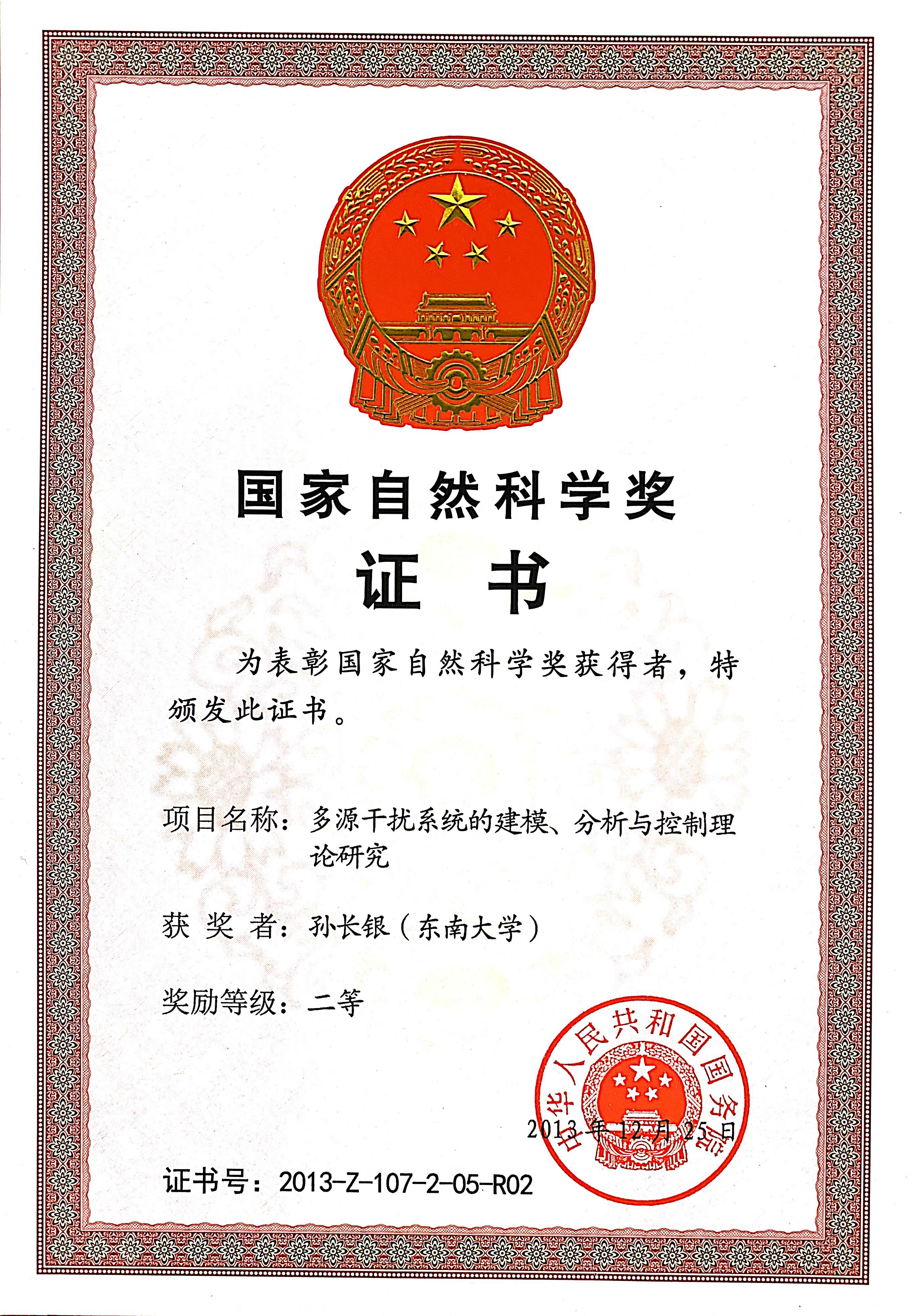 2013年:12月,动画疯 孙长银教授与北京航空航天大学的郭雷教授共建的课题组项目“多源干扰系统的建模、分析与控制理论研究”荣获国家自然科学二等奖。