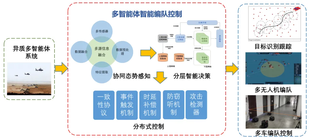 聚焦智慧交通、网络安全、指挥控制等国家重大需求,在集群协同态势感知、智能决策和分布式控制、集群系统安全控制、智能交通控制、智能博弈对抗和战法挖掘等方向开展基础理论和应用研究,承担了国家科技创新2030 重大项目课题、装发预研项目等一批重要项目。