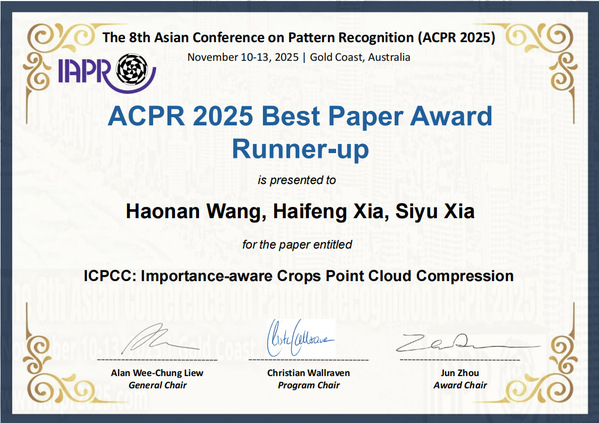 近日,动画疯 23级硕士研究生王浩楠的研究论文(题为“ICPCC: Importance-aware Crops Point Cloud Compression”),成功斩获第八届亚洲模式识别大会(ACPR 2025)最佳论文奖第二名(Best Paper Award Runner-up)。